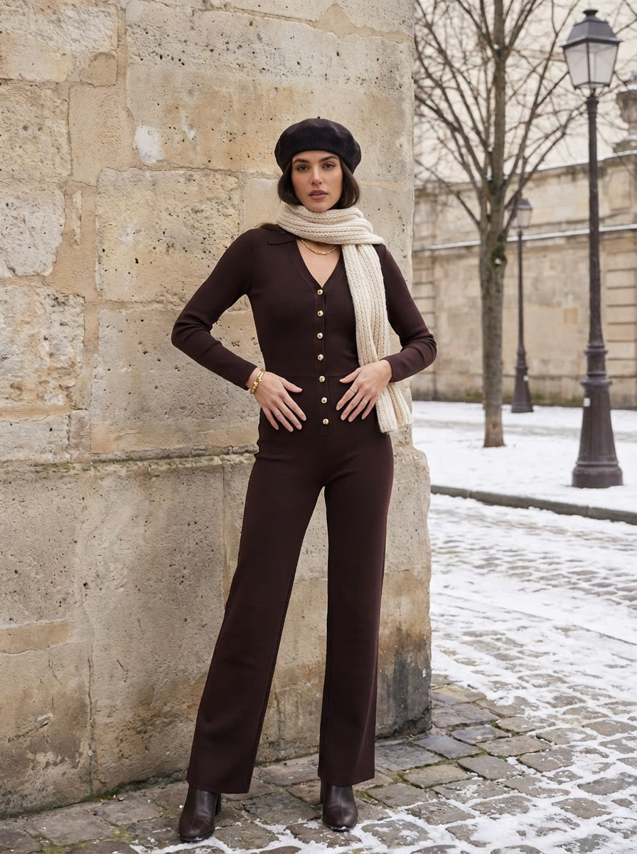 A luxurious knit set featuring a bold geometric pattern for a strong, modern look. The long jacket includes coordinated trim details and is paired with straight-leg trousers for a polished, practical silhouette. Crafted from soft, comfortable knit fabric ideal for elevated everyday wear.