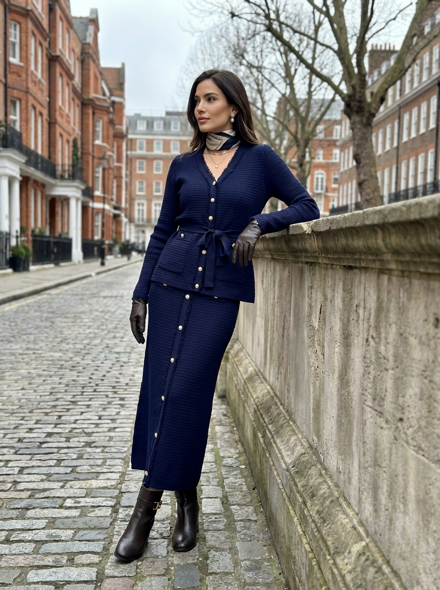 A luxurious knit set featuring a bold geometric pattern for a strong, modern look. The long jacket includes coordinated trim details and is paired with straight-leg trousers for a polished, practical silhouette. Crafted from soft, comfortable knit fabric ideal for elevated everyday wear.